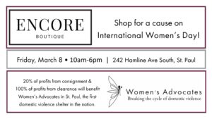 On International Women’s Day, 20% of profits from the consignment store & 100% of profits from clearance will benefit Women’s Advocates in St. Paul, the first domestic violence shelter in the nation.